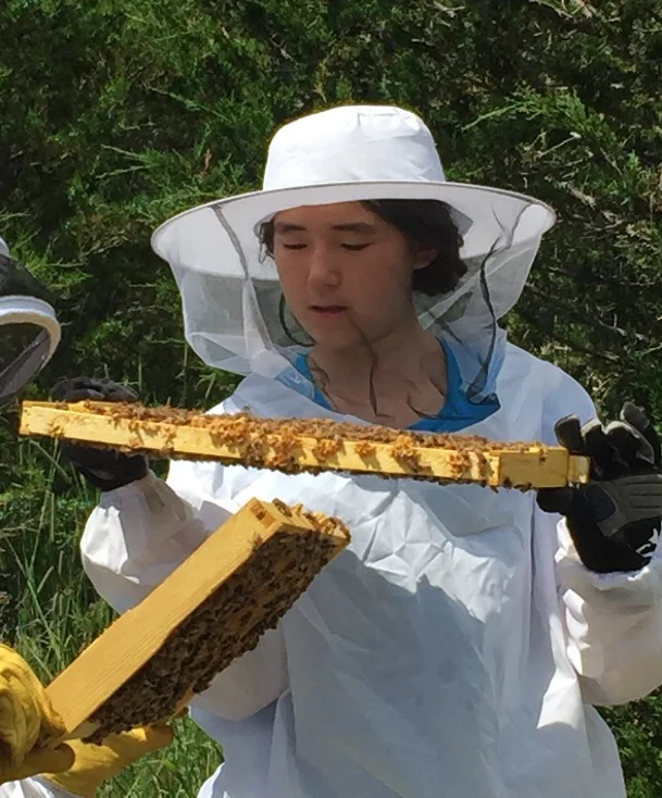 Cath and M did what beekeepers do and M has really taken a shine to it. She's right in there inspecting frames and taking care of them.
